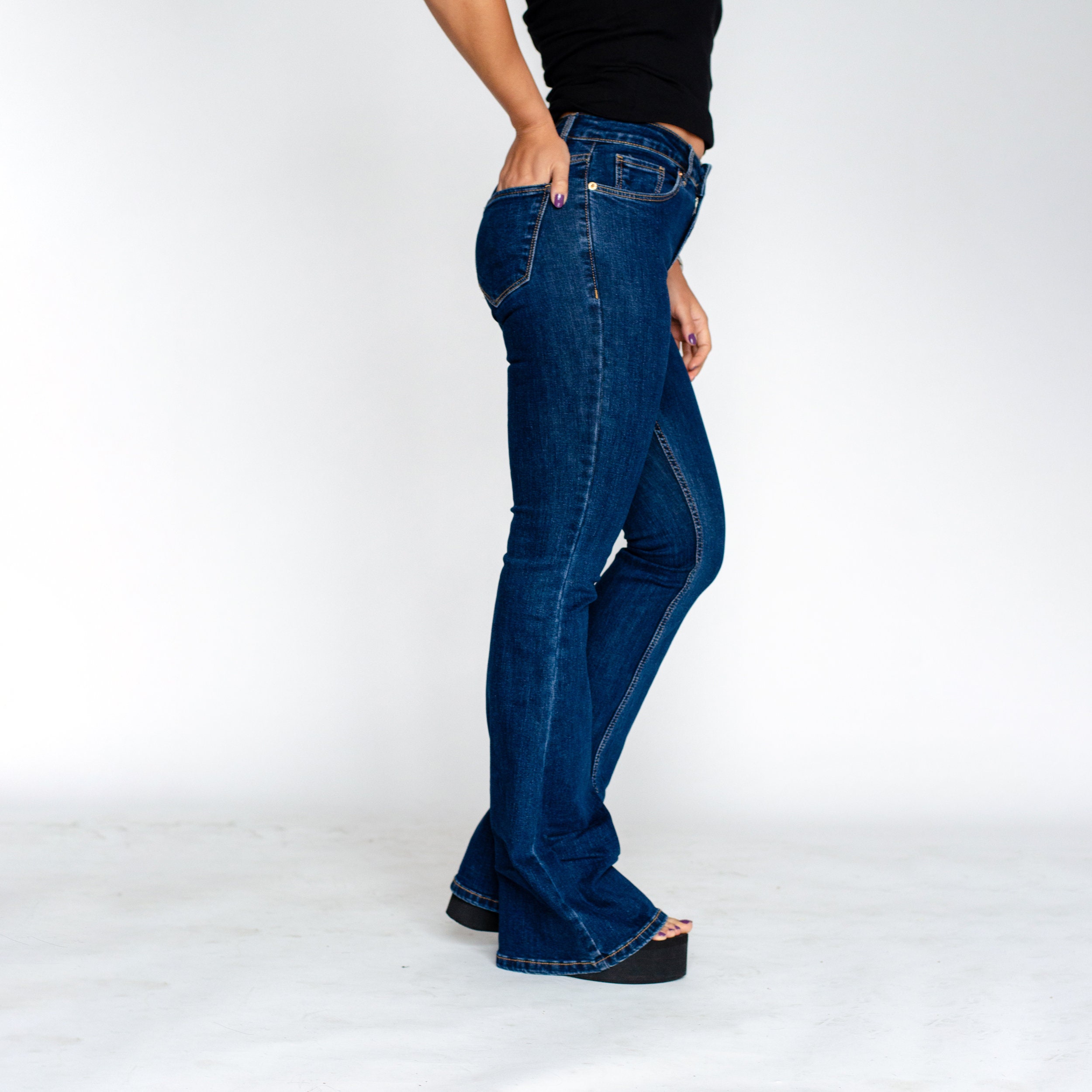 High Waisted Flare Jeans: Dark Blue Stretch Denim